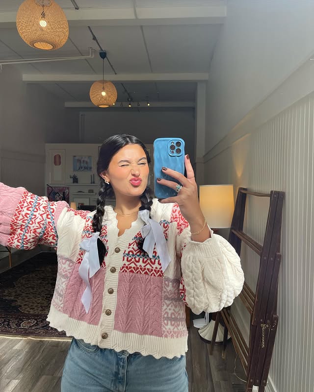 With its colorful patchwork knit, vintage-inspired buttons, and soft cozy feel, it’s the piece you’ll keep reaching for whether you’re layering over a dress, pairing with jeans, or just lounging in style.